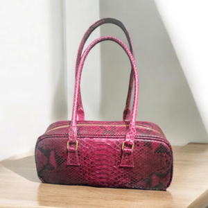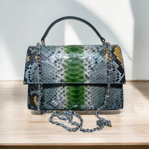 Experience the elegance of our Borneo python skin party bag, expertly crafted to express Indonesian art. Made from genuine Borneo python skin, this bag is coated with a protective layer to ensure durability in any season, rain or shine, summer or winter. Carry it by hand, on your elbow, or use the adjustable chain strap with leather insert to wear over the shoulder. We pour touches of turquoise, black and gold to create this unique and elegant piece, this bag is made with a size of 24 cm x 22 cm x 10 cm so it can accommodate several of your necessary belongings. Try to feel the touch of our handiwork.